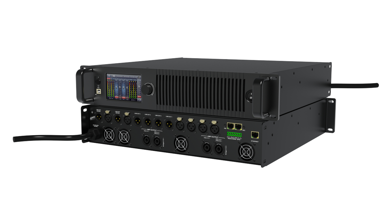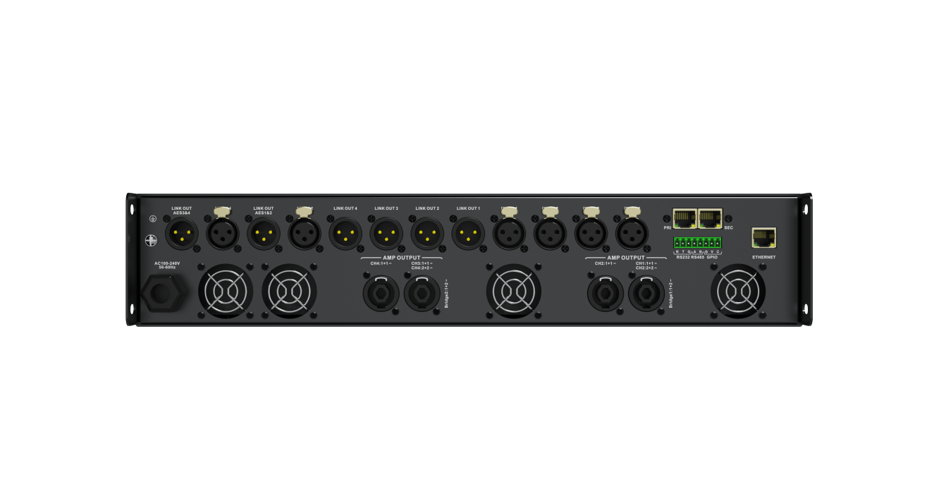 全新芯片架构平台,ADI SHARC主频1GHZ的DSP芯片ADSP-21569负责高性能DSP计算, 4核ARM处理器负责系统控制及功放监测。适配各种音源输入,集成模拟、AES3、Dante/AES67输入,可以任意音源备份;内置WEB服务器,实现免安装上位机控制,全新B/S架构控制设备,可外网远程管控;高精度功放电流电压检测,实时监控功放状态;标配音箱参数库设置和调用功能,适配不同的音箱,快速调用参数;标配FIR功能和FIR designer设置功能;4*1500W8欧/4* 2250W4欧,桥接2* 3200W8欧数字功放。